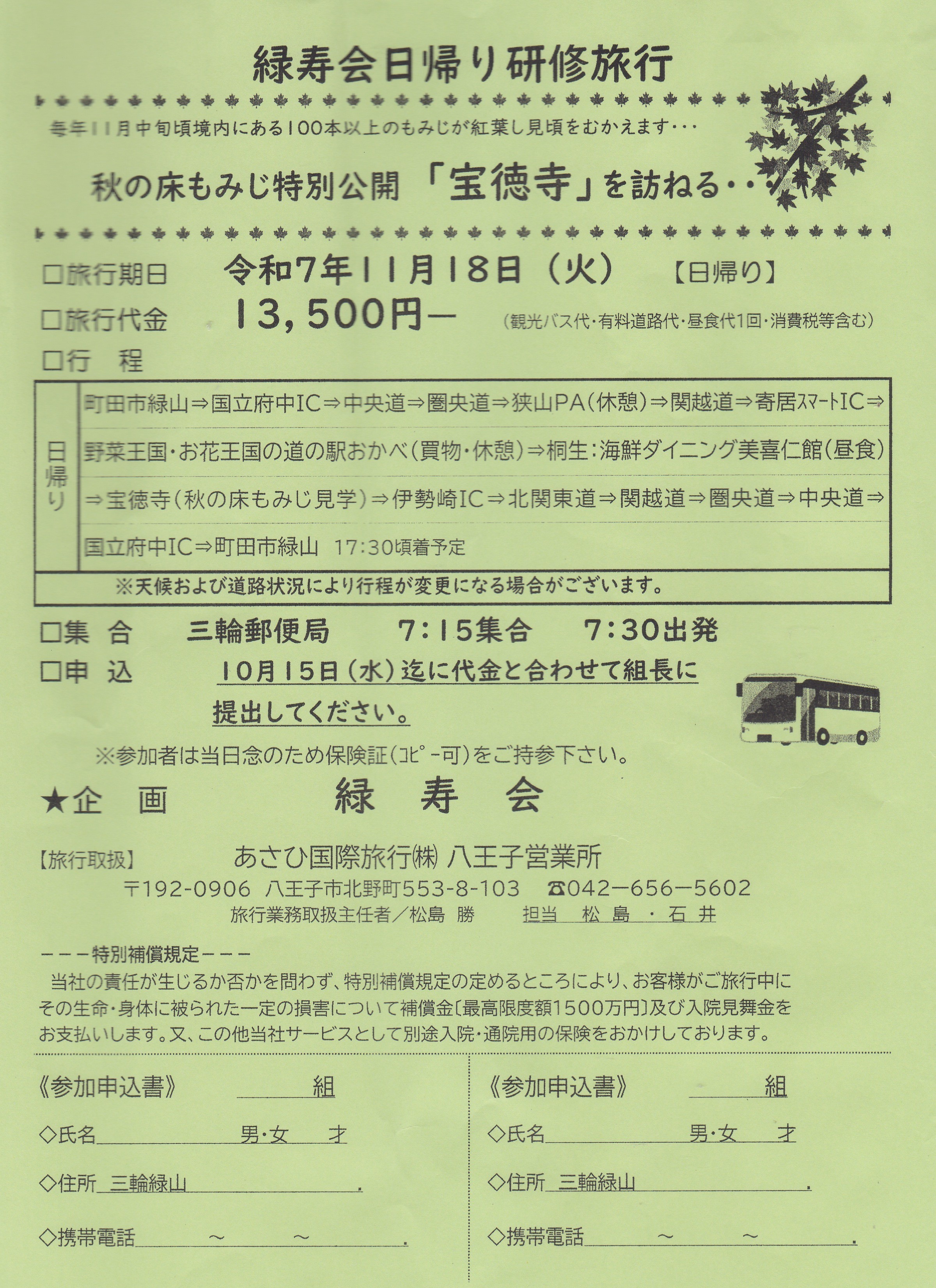 2025年9月16日 11時02分 春の東京湾クルーズに続き第2弾を、11月18日(火)に群馬県桐生市『宝徳寺の床もみじ』のもみじ狩りを、添付チラシの様に実施いたします。