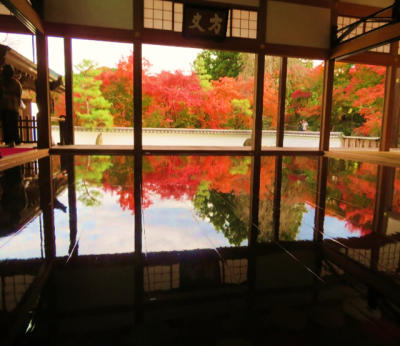 外の紅葉が鏡のように映し出されています(クリックで拡大)