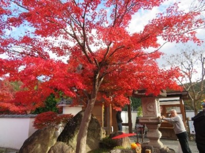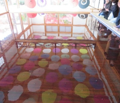 先ず本殿に入る前に美しく飾られた傘の前で記念撮影をし、下足を脱いで入 ると、すばらしい絵模様の襖を擁した空間がありました。続いて足を運んだ 28畳の大広間では群馬のやさしい陽の光が床一面に射しこみ、その光が床に 反射してまるで鏡が床にはめ込まれたのではないかと眼を疑うばかりに、石庭 の外に林立する真っ赤に紅葉した「もみじ」や黄色に染まった木々の葉を見事 に映し出していました。陽のあたっている明るい部分と訪れた人々のいる暗い 部分の陰影が一層美しい床もみじを演出しているように思われました。さすが 関東一の「床もみじ」の名にふさわしいと感動する光景した。